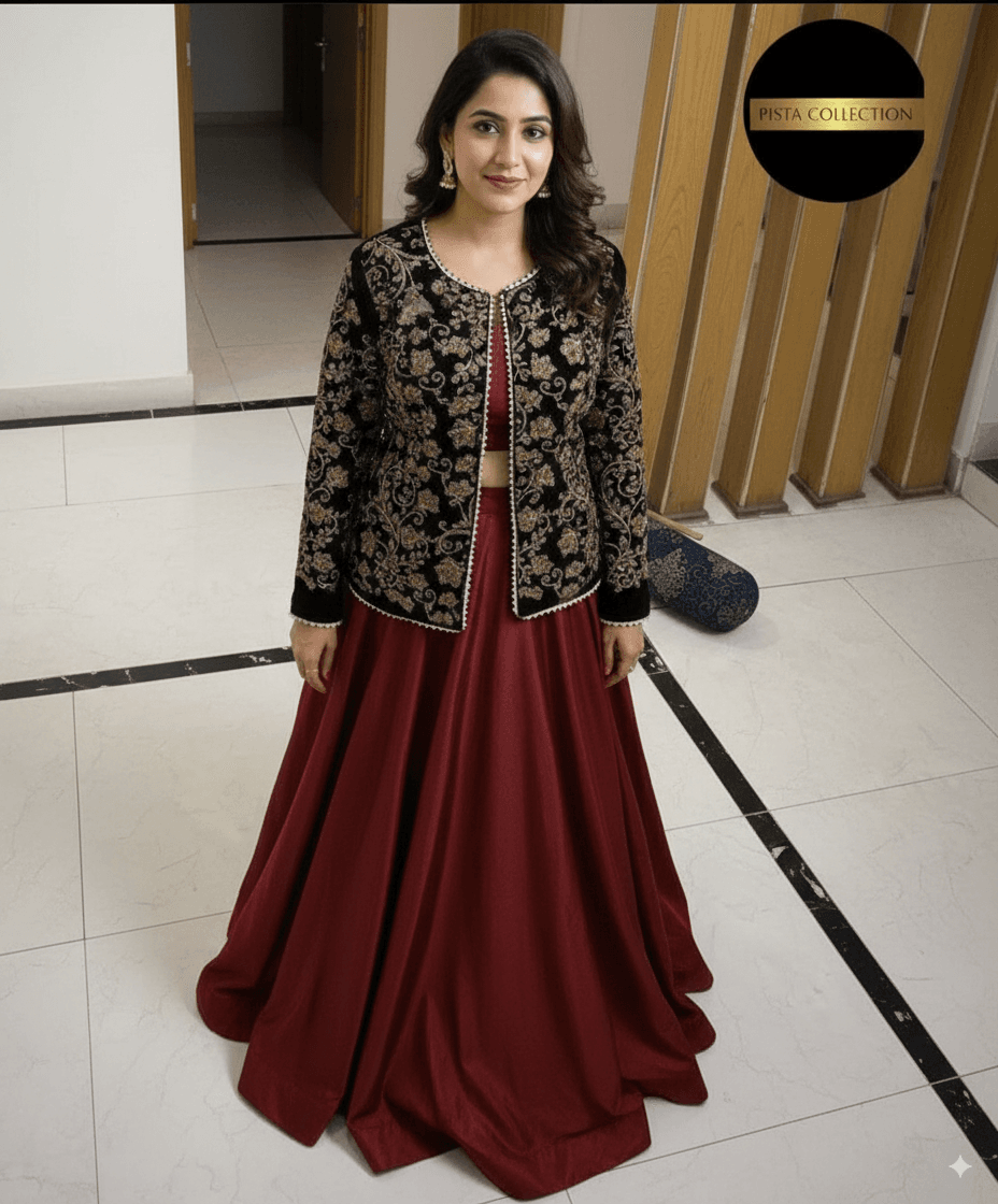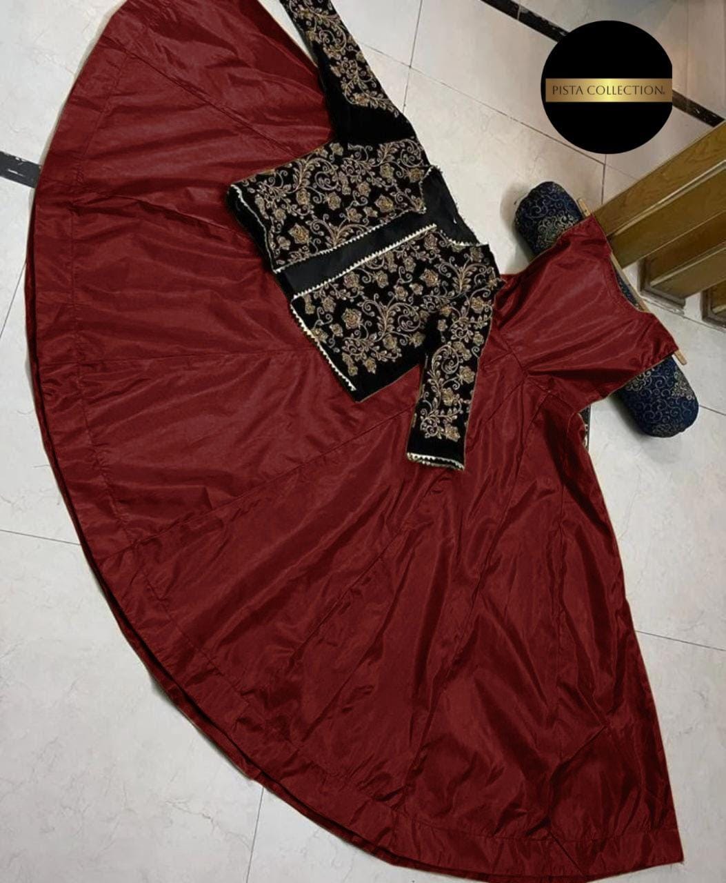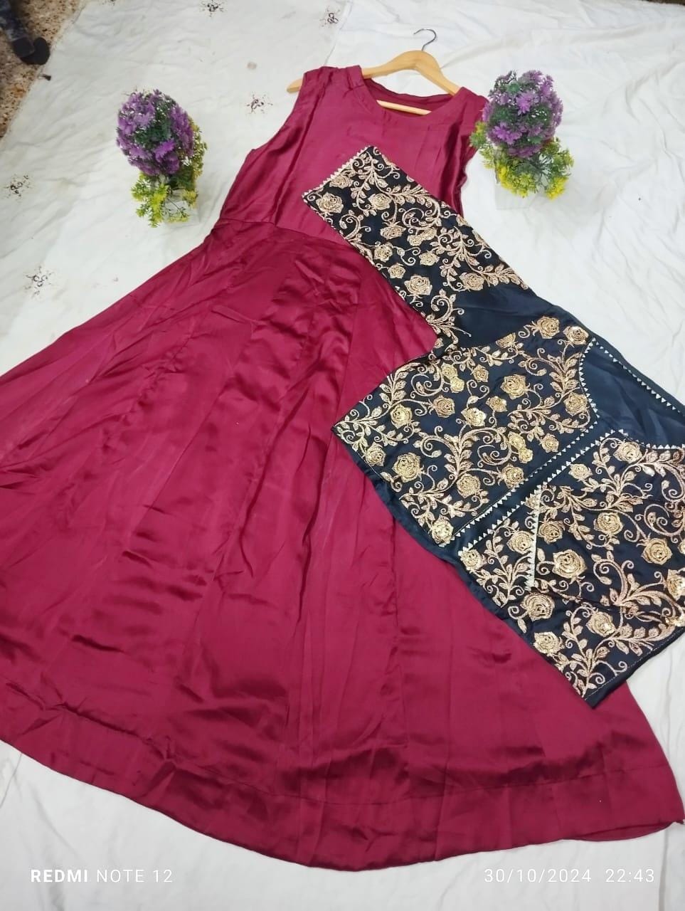 Discover the charm of timeless elegance with this Maroon Silk Embroidered Maxi and Koti set. Crafted from premium silk, the maxi is beautifully designed with intricate embroidery, a flattering round neck, and a graceful 120 cm flare length that flows with sophistication. The embroidered koti adds a chic layered touch, while the plain design of the trouser keeps the look balanced and refined.